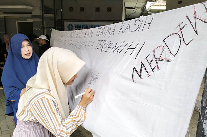 Sejumlah penerima itu membubuhkan tanda tangan dalam sebuah spanduk.